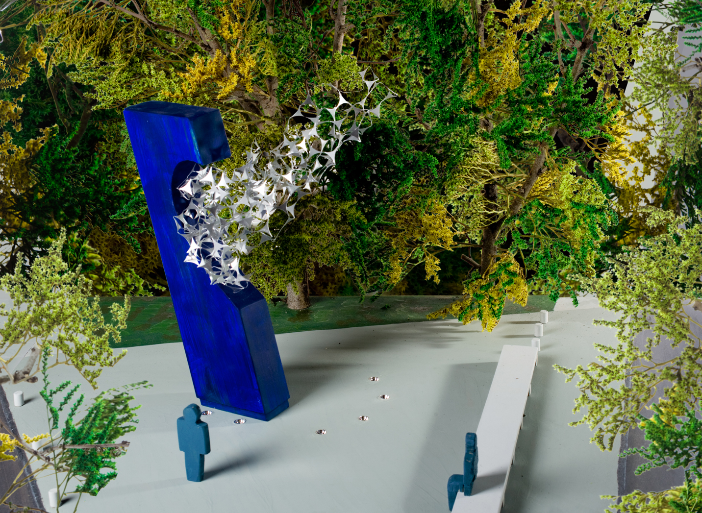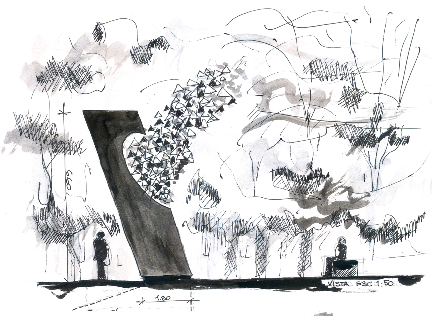 La idea central del memorial es recrear la analogía entre el entorno del bosque rodeado de árboles y su perduración a través de las semillas que vuelan en el viento, con la de un tronco inclinado y un vacío corazón partido, del cual emergen miles de semillas de corazones.